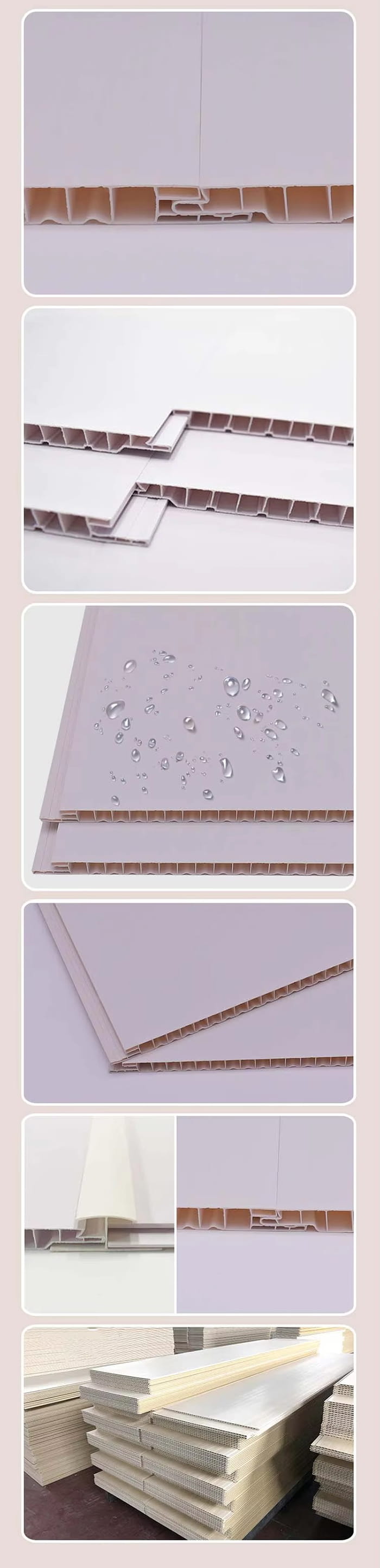 Tectum PVC est materia decorativa e polyvinylo chloride (PVC) resina ut materia rudis principalis, addita calcium carbonas et stabilimentum, et componitur per caliditatem et altam pressionem processum. Superficies typographicam, translationem vel laminationem technologiam adhibet, quae varias texturas simulare potest, ut granum ligni et granum lapideum, et proprietates habet probationis et humoris, ignis retardat, leve pondus et altum robur. Scenas apta est cum humiditate alta vel alta requisita decorativa sicut coquinae, thermae, hospitalia, et spatia commercialia, et optime substituuntur pro gypso tabularum et aluminium et gustu traditis.